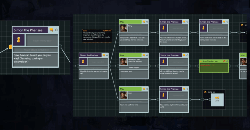 Our goal is to reflect the player character Max’s growth through meaningful choices rooted in what players learn along the way. Rather than offering clear right-or-wrong answers, dialogue presents dilemmas tied to the social tensions of each town, encouraging reflection and consequence. These moments connect biblical themes with engaging storytelling while keeping the experience player-driven.